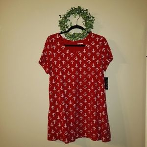 NWT KIM ROGERS Women's Tunic Length Top - 29" From Back Neck to Hem; Pleaded Back; Size Large; Red With White Ship Anchors; 57% Cotton/38% Rayon/5% Spandex; New Condition.