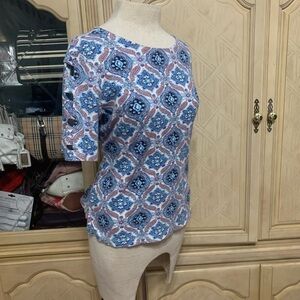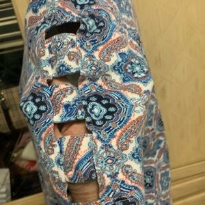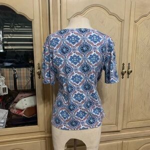 Cute and colorful Kim Rogers tea with a gorgeous design in blues, orange, white and black great with a pair of blue jeans or even a pair of white capris has a crewneck line and sleeves have open spaces that gives it a very stylish look 100% cotton machine, washable and comfortable and soft