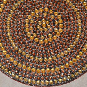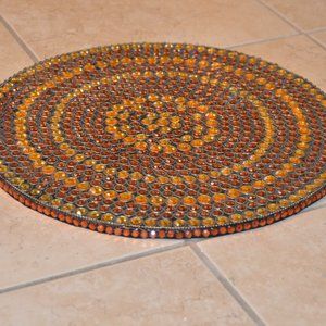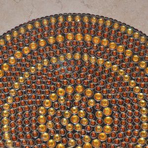 This is a KIM SEYBERT PLACEMAT/CENTERPIECE/CHARGER. This comes from a non-smoking home. It is a round-shaped beaded placemat/centerpiece and accented with brown and gold/citrine colored beads. This is a VERY RARE placemat. it measures 15 1/4" across by 3/8"H. The front is accented with 95% plastic beads and 5% brass metal rings. The back is made of 95% medium density fiberboard and 5% fabric. This is spot clean only. Pictures of actual item. I have a total of 4 of these for sale...priced individually.