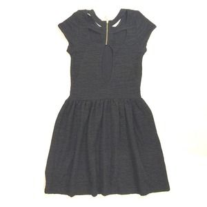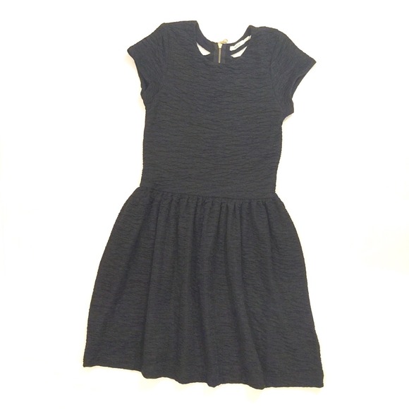 Shimmering Fit & Flare Dress with crinkled texture. Stretchy knit construction with cutouts at the back and exposed metal zip. Finished with a gathered a-line skirt.