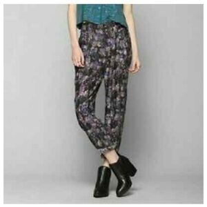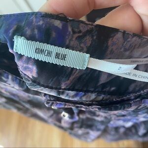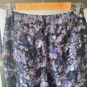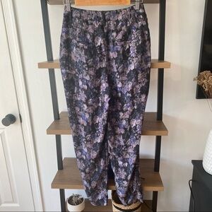 Purple printed watercolor design high rise parachute jogger pants. Side slit pockets, back faux welt pockets. Belt loops, button closure and zip fly. Lightweight fabric.