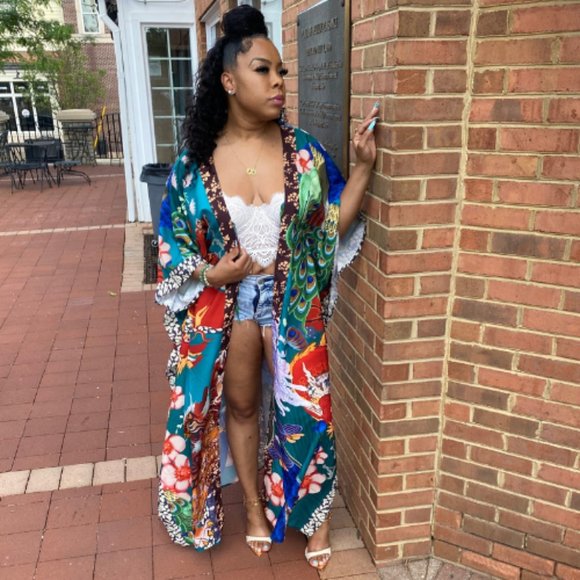 The KIMONO is a rich colorful one size fits all piece. Wear it as a cover up, stylish robe or just a statement piece to your outfit.