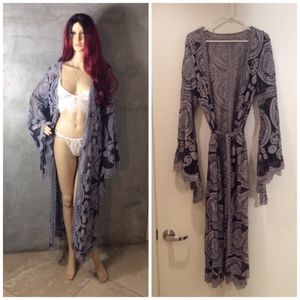 UNIQUE STYLES BOUTIQUE - New custom kimono lace robe cardigan duster long maxi cover up ombre black dark gray colors with flare bell sleeves has a belt tie waist. 51" L x 20" W inch on seam. Polyester. Very BoHo shabby chic hippie gypsy and spell & the gypsy collective casual Beach pool vacation summer for love and lemons collection 12th tribe festival tribal vintage India free people Whitney EveD jen's pirate booty summer Halloween costume, cosplay spring Bohemian Mumu beautiful lovely gypsie raga peasant Desired Collection Maisie & The Muse style. ** More designs go to "brand" under "Unique Styles robe"