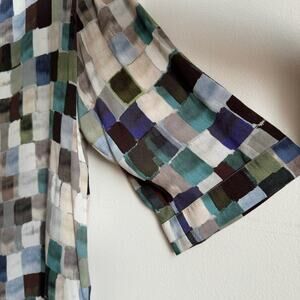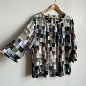Details: KIN by John Lewis blouse with a check print in a blue, green, brown, and cream color palette. Round neckline with keyhole V detail at the center front, and three quarter length sleeves. Lightweight fabric, perfect for spring and summer at the office, at home, or out and about. A bit artsy, unique, and maximalist but muted!