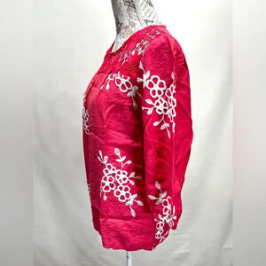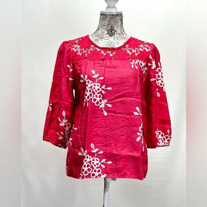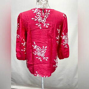 Bright coral blouse with cream embroidery from KINDRED, size PM. Top has 3/4 balloon sleeves, scoop neckline and roomy bodice.