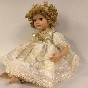 This adorable KINGSTATE Porcelain Doll is numbered '280 out of 3500' which were made from the Dollcrafter collection, making it a nice collectible. Since she's in the sitting position, this makes for a great doll to sit on the bed in a guest bedroom ! She is approx. 14" tall in the sitting position. Her bloomers underneath have a couple of stains on them, but that doesn't show and could be washed out. What a cutie pie :)