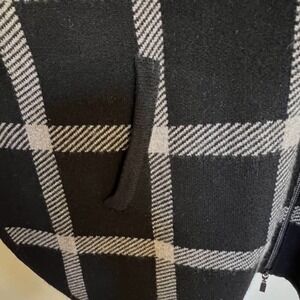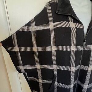 Details: Black and Suede (tan) plaid zip mock neck poncho, featuring full front zipper, poncho styling with open sides, and front pockets.