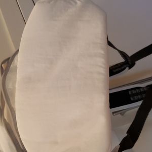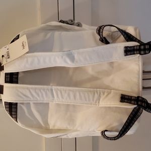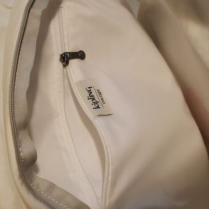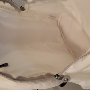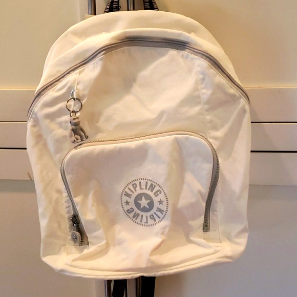 White Kipling Backpack with inside zip pocket, large open compartment and exterior front zip pocket. Black/Gray handles, with white back straps.
