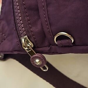 Open interior pocket for cellphone and pen. Side snap exterior pocket. Zip closure. Adjustable strap.