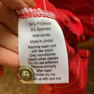 Silky feel. 94% poly, 6% spandex. Good stretch. Side split hem. Pinstripes are black, yellow and blue. 3-button collar, extra replacement button included. Like-new condition.