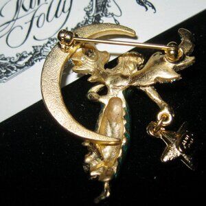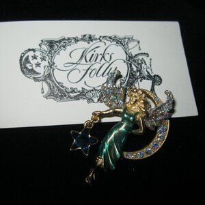 9/18/25..."KIRKS FOLLY New Old Stock FAIRY W/SPARKLING WINGS & CRESCENT MOON W/DANGLING BLUE STAR"...Here's one very rare brooch that has only been seen on very rare occasions and now it is available to you! Her wings are set with Aurora Borealis stones as is the crescent moon behind her. In her hand she holds a blue Aurora Borealis stone in the star and she wears a gown of green. She is signed on the reverse side of the star as well as on one of her wings! The finish on this lovely piece is deluxe gold tone and she measures 1-3/4" by 1-1/2" and has a locking clasp on the back! So, this wonderful rare piece is signed 2 times and she is wonderful. did you notice she is barefoot? Wish I could spend my life barefooted too! The lucky buyer will receive her in a FREE gift box (while supplies last). Any questions, please feel free to contact the seller.