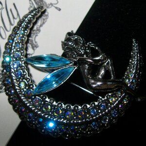 "KIRKS FOLLY RARE/NOS/SIGNED FAIRY W/BLUE WINGS ON CRESCENT MOON BROOCH"