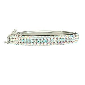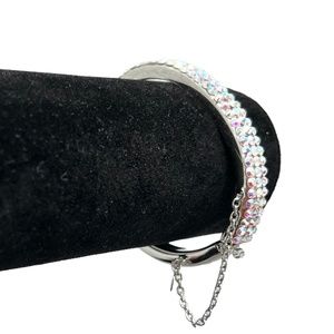 Vintage Kirks Folly silver tone and aurora borealis clear crystal bracelet. Missing 2 crystals, but otherwise in good preowned condition.The hard bangle has a chain for extra security. 2.75"L x 2"W