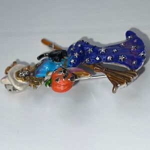 What a joyful addition to your spooky style! This starlight witch pin/pendant glistens with enameling in fun, festive colors. From Kirks Folly.