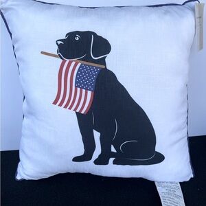 Add a touch of charm to your home with this patriotic dog throw pillow. Featuring a black dog holding an American flag, this pillow is perfect for any room. The white background complements the design beautifully.