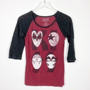 Awesome KISS 3/4 raglan baseball style t-shirt. Burgundy body with black sleeves. Large KISS graphic on front. Scoop neck. Straight hem with side slits. Standard fit. Fabric: 80% Cotton, 20% Polyester. Good condition, pre-loved, no holes or stains.