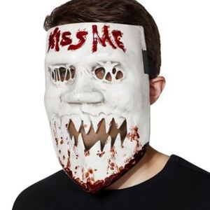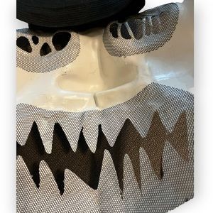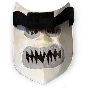 Plastic material with black stretch band at the back and cushion in the inside front part of the mask.