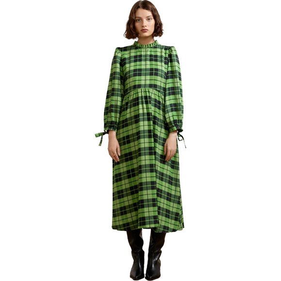Elsa Frill neck green check midi dress