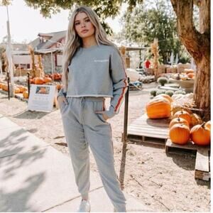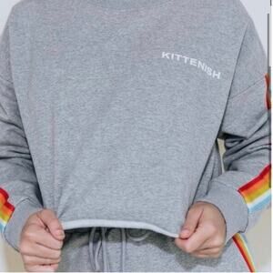 KITTENISH Rainbow Side Stripe Cropped Raw Hem Grey Pullover Sweatshirt Medium