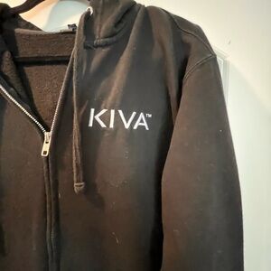 Stylish black zip-up hoodie with KIVA logo. Comfortable and versatile.