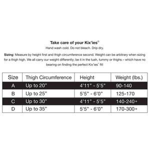 Sizing: Measure by height first and thigh circumference second. Weight can be arbitrary when sizing for a thigh-high. We all carry our weight differently; be it in the tush, tummy, or thighs – which have no bearing on finding the perfect Kix’ies® fit! Time to kick those binding tights and outdated hosiery to the curb