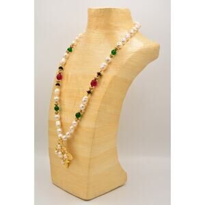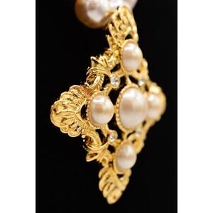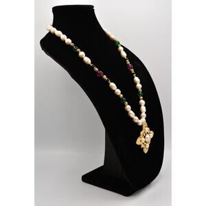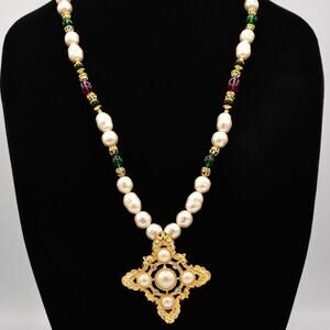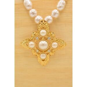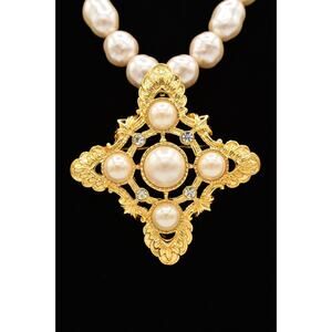 KJL Avon Necklace Maltese Cross Cabochon Pearl Beaded Gold Crystal Signed Bin3B