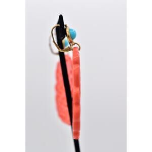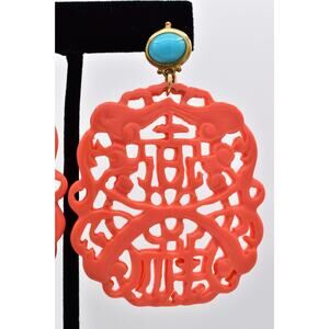 KJL Coral Carved Resin Cutout Drop Earrings Turquoise Oriental Signed Y2K BinBF
