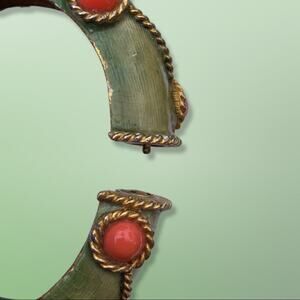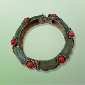 KJL Coral Glass & Green Enamel Mongul Clamper Bracelet c. 1960’s Measures 6 1/2” circumference. In very good vintage condition.