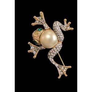 KJL Frog Brooch Jelly Belly Faux Pearl Gold tone green eyes Kenneth Jay Lane pin
