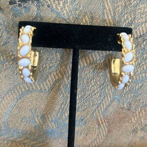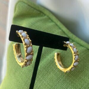 • Fabulous Vintage © KJL Signed Kenneth Jay Lane Collection Gold Tone Hoop Pierced Earrings with White Oval Stones