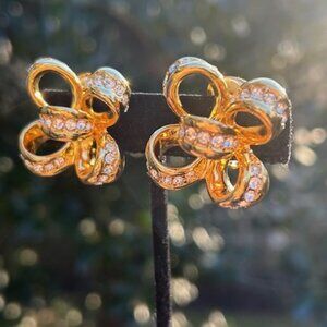 • Fabulous Vintage Kenneth Jay Lane ”©️ KJL” Signed Gold Tone Sparkly Rhinestone Ribbon Bow Clip-on Earrings