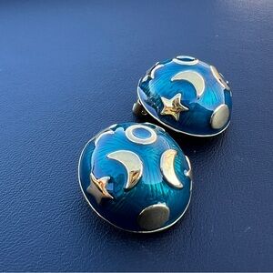 Kenneth Jay Lane elegant round dome earrings with blue enamel and gold accents. Unique celestial design. EUC.