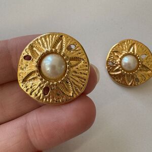 These beautiful earrings have a gold toned clamshell dangling from a gold toned sand dollar with a faux pearl in the center. Each earring is stamped KJL for Avon, are clip-ons and are in very good vintage condition.