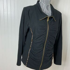 Women’s K. Jordan black jacket with leopard print accents and gathered front. EUC Size medium 19” armpit to armpit 13” armpit to bottom