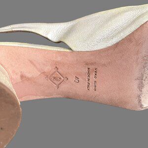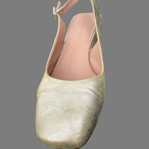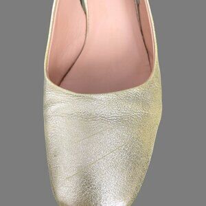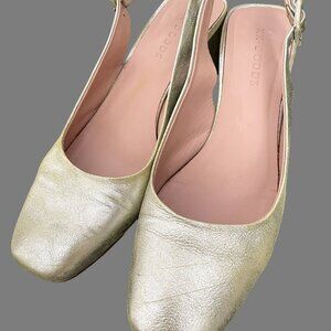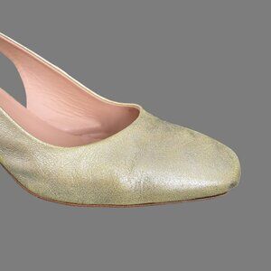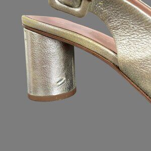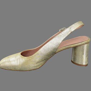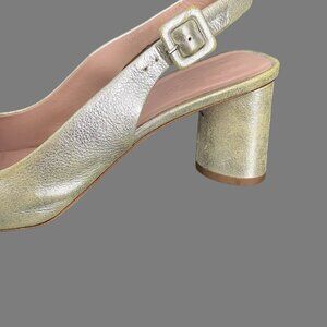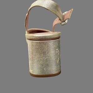 Chucky heal, Italian leather, adjustable sling back. These shoes are a shiny gold with around a 2" high heal making them great for longer wear than a smaller heal.