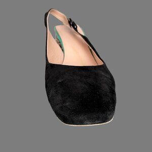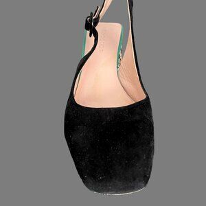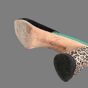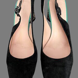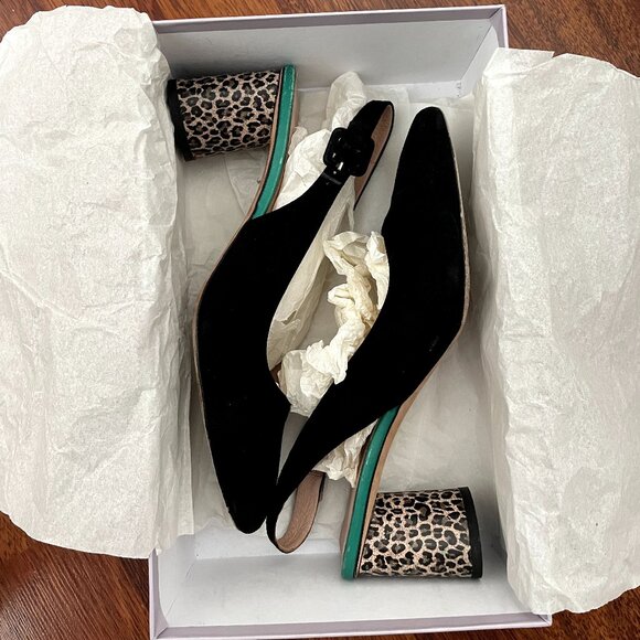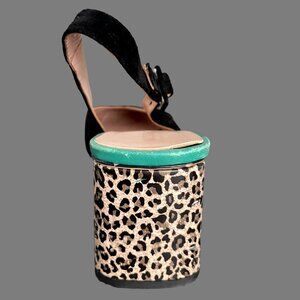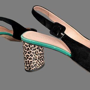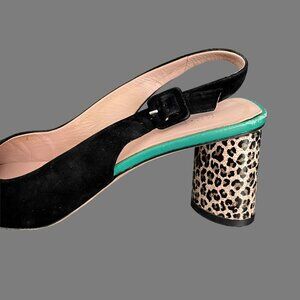 Chucky heal, Italian leather, adjustable sling back. These shoes are a black suede with around a 2" leopard print high heal. They have a beautiful highlight of teal giving them a little bit of pop.