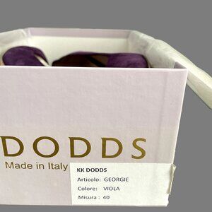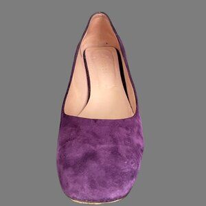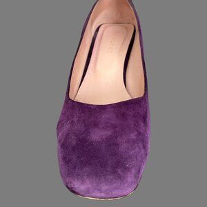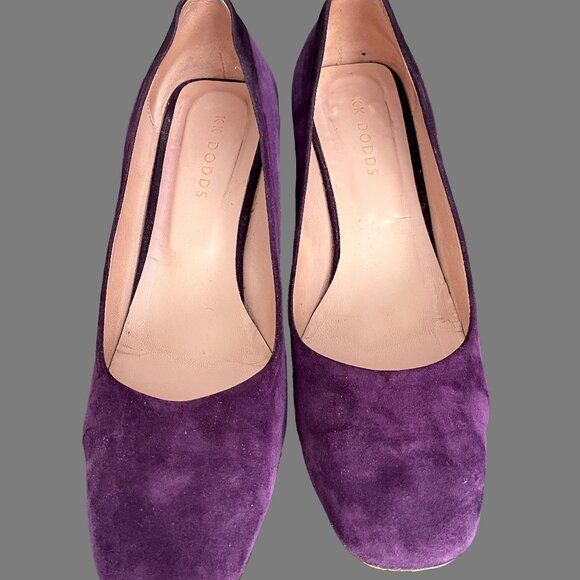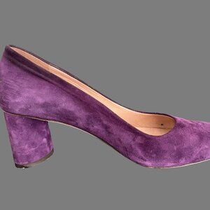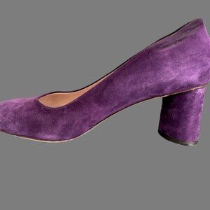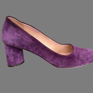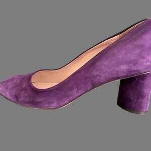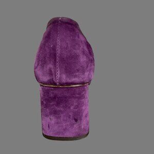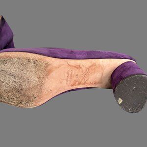 Chucky heal, Italian leather, adjustable sling back. These shoes are a lovely violet suede with around a 2" high heal.