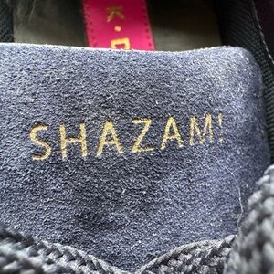 Marine blue suede leather with navy glitter, metallic blue, gold and navy leather accents. Navy color laces and white rubber soles. Made in Italy.