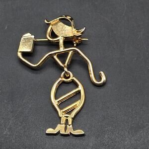 KK/ED Signed Book Lover Brooch Stick Figure Lady Reading Book Gold Tone