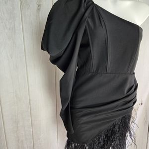 KLESIS BLACK ONE SHOULDER FEATHER MINI DRESS