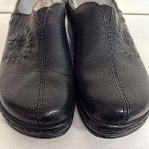 klogs portofino clogs black leather upper floral whip stitched detail in