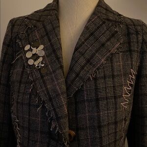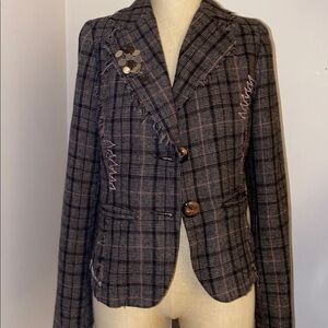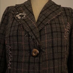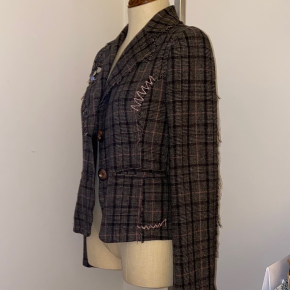 Chic plaid blazer with unique pink stitching. Features button closure and tailored fit. Ideal for stylish layering. Embroidery and embellishments.