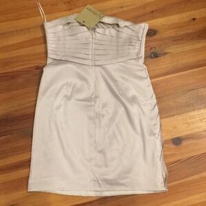 Beautiful satin, strapless dress by KLd. Signature. Original Boutique tags still attached. Poly, cotton, spandex blended fabric is machine washable. Color of the fabric is hard to describe as it's nude, blush, cream, pink. Fabric is layered on the front of the dress on the diagonal and where it gathers there is a rosette, flower. back is layered horizontally at the bust line. Rear zipper. Approximate measurements shown in photos are of bust (32"), waist (30"), hip (38") and length from waist (26.5") and bust (20"). Beautiful fitted cocktail dress in excellent unused condition. Dressy, cocktail, wedding, special occasion, formal, strapless, sleeveless, boutique brand, party, semi formal, holiday, prom