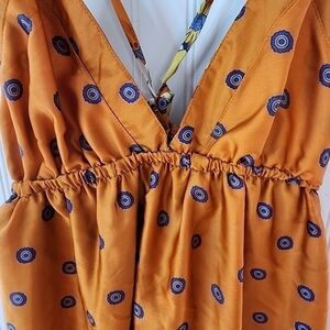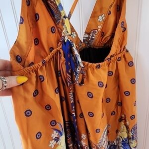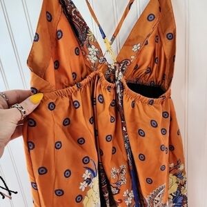 KLD-SIGNATURE spaghetti strap silky dress straps criss cross in back, leaving the back open. In front, it has a deep v-neck. Vibrant orange midi dress with paisley and floral print. NWOT SIZE L RUNS MORE LIKE A MED. Last picture shows lining.