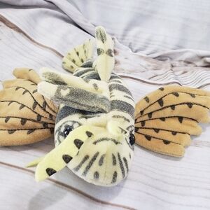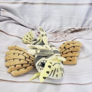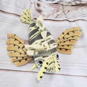 This K&M Yellow Gray Striped Fish Plush Beanbag Stuffed Toy is perfect for all occasions. It measures 9 inches and has beautiful gray eyes that will captivate anyone who looks at it. This retired toy is washable and comes from China. It is recommended for children ages 3 and up and is small enough to take anywhere. The toy is part of the Fish character family and is great for collectors or as a gift for someone special.