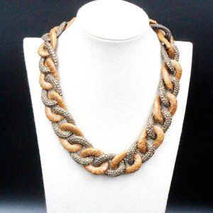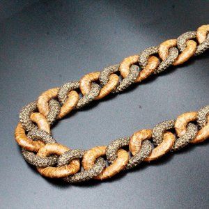 This stunning chain necklace, crafted by KMO Paris in the 1990s, showcases a unique and eye-catching design. The necklace features a series of large chains that create a striking visual impact, with each chain adorned with a jappaned star dust glittery effect. Alternating with these chains are segments covered in rich brown leather, adding a touch of texture and elegance. Although the original tags are missing, the necklace is in excellent condition, exuding a timeless charm. Measuring 18" in length and 1" in width, it is a statement piece that will effortlessly enhance any outfit.