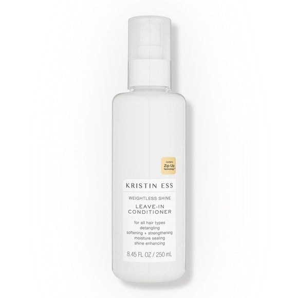 The Weightless Shine Leave-In Conditioner Spray for Dry Damaged Hair from Kristin Ess Hair primes hair for styling while instantly detangling, softening + strengthening strands.