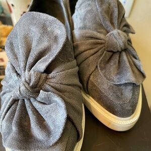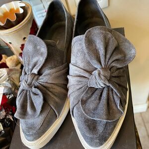Knitted & Knotted Suede Bow Flat! Great shoe with even a little lift! Tapers in to point at widest part before toes. This is a quality shoe only worn once. Love it but the taper not right on me. Gorgeous quality sole and shoe.