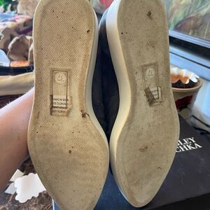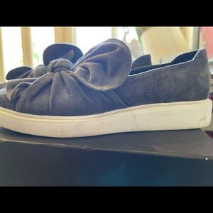 Knitted & Knotted Suede Bow Flat! Great shoe with even a little lift! Tapers in to point at widest part before toes. This is a quality shoe only worn once. Love it but the taper not right on me. Gorgeous quality sole and shoe.