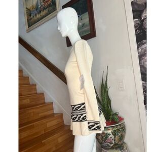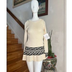 Our favorite sweater dress from the For Love & Lemons KNITZ collection in collaboration with Urban Outfitters. Ribbed knit in a fitted silhouette with a flared skirt featuring an embroidered patterning at the skirt and cuffs and finished with a ribbed-banded hem and crew-neck.